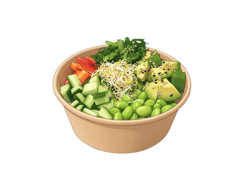 Zutaten: Sushi Reis, Avocado, Edamame, gurke, Paprika, Algensalat und Rucola